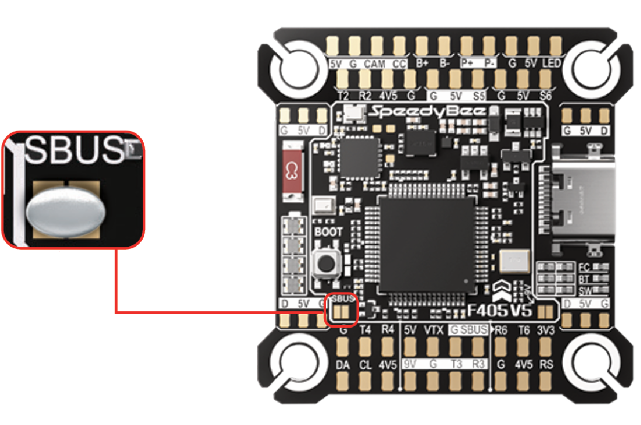 当您将飞控直接插入部分图传天空端(如含内置 SBUS 接收机的图传设备)时,天空端内置 SBUS 接收机可能会与您连接的外置 SBUS 接收机发生冲突,导致飞控无法正常识别信号。为此,F405 V5 飞控提供了 SBUS 短接焊盘,便于您根据实际连接需求灵活切换。