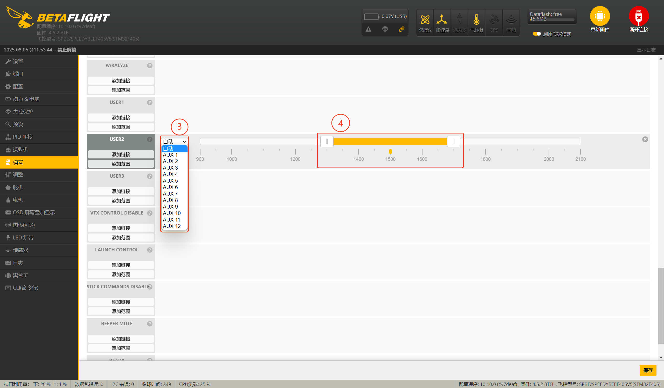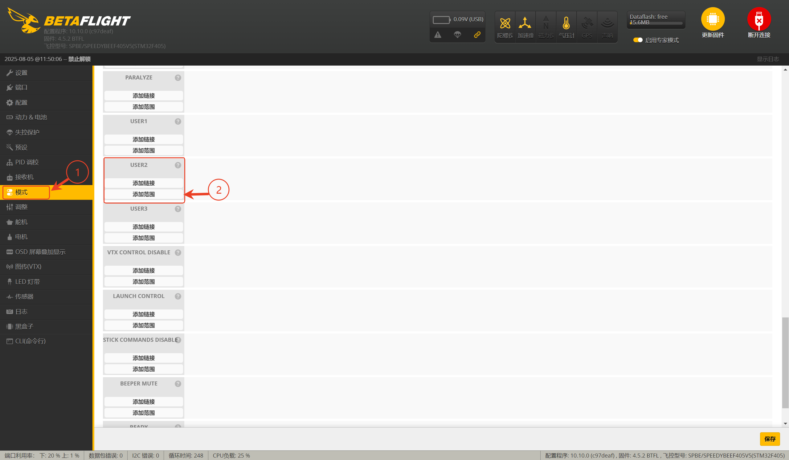 1.打开 Betaflight地面站,进入 “模式”(Modes) 页面