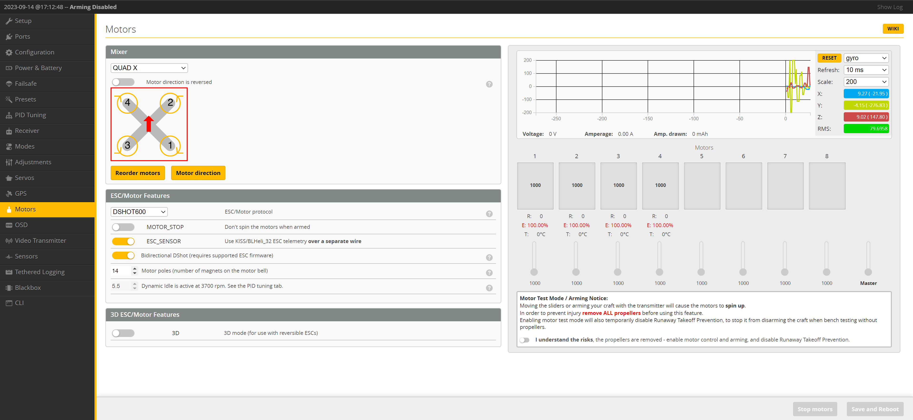 请在 Betaflight 的“电机”页面上按顺序旋转每个电机( 旋转电机时,请确保已拆下螺旋桨 ),并检查旋转方向是否与 Betaflight 上显示的方向一致。